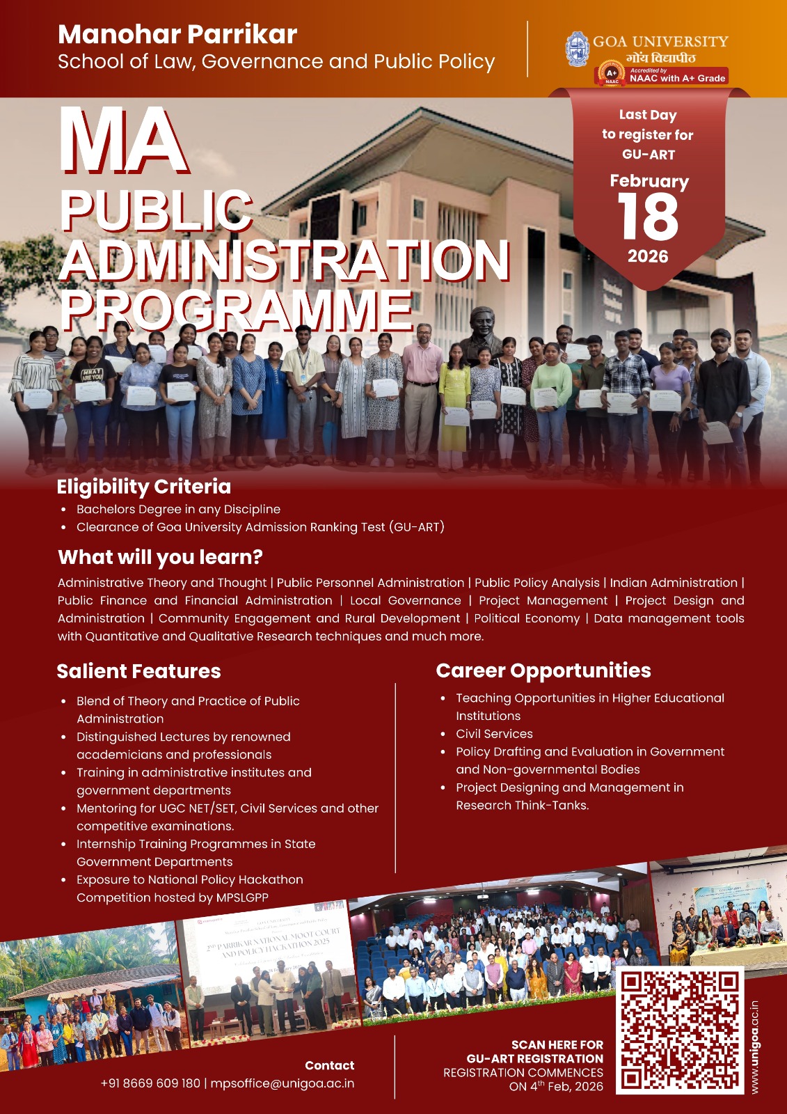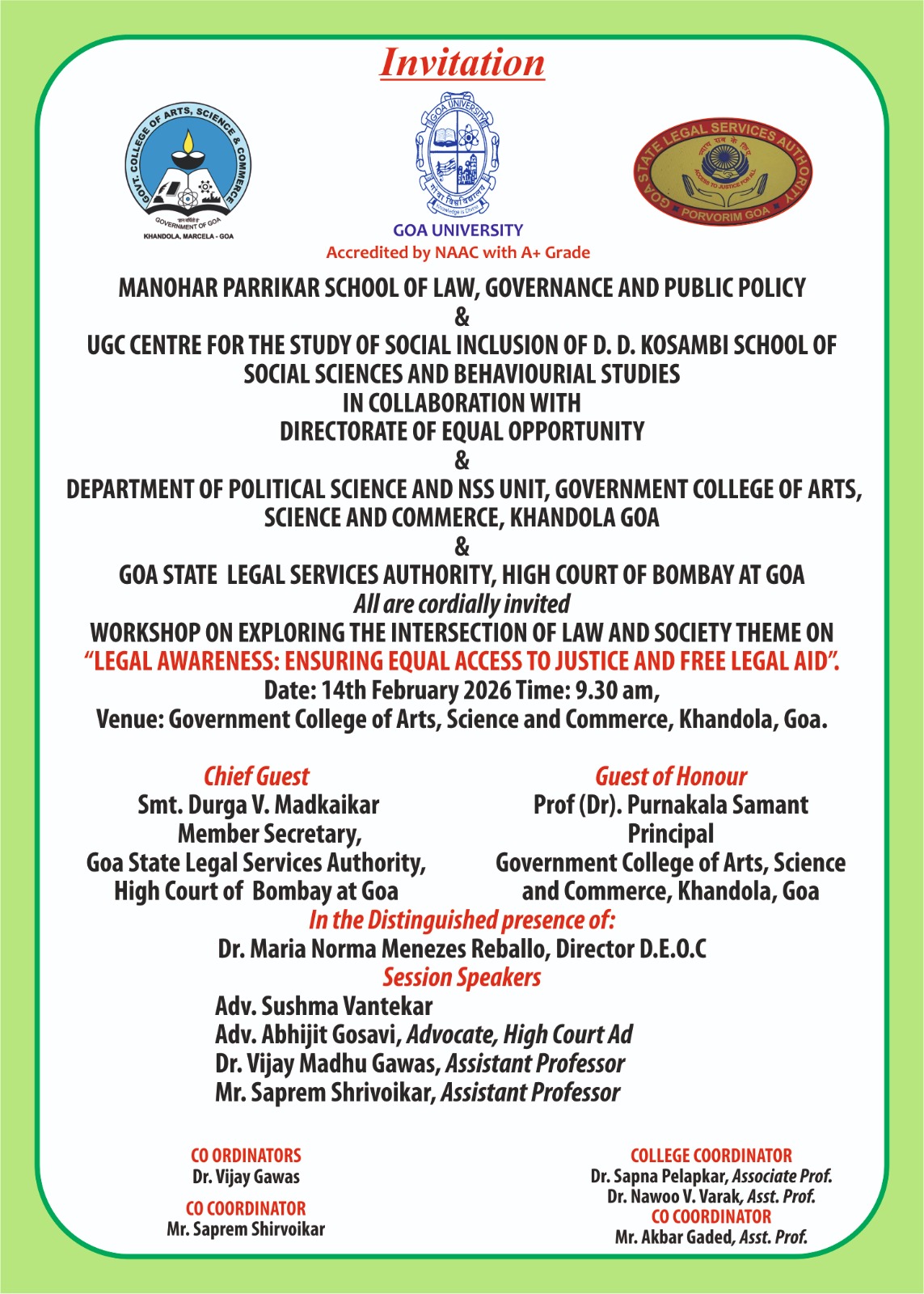 Manohar Parrikar School of Law, Governance and Public Policy (MPSLGPP) & UGC Centre for the Study of Social Inclusion, D.D. Kosambi School of Social Sciences and Behavioural Studies (DDKSSSBS) in collaboration with Directorate of Equal Opportunity (DEO) and Nirmala Institute of Education, Panjim, Goa, is organising a workshop on Exploring the Intersection of Law and Society, with the theme on "Legal Rights and Empowerment of Minority Communities in Goa: Challenges and Perspectives". Date & Time: 13 Feb 2026, 9.30 am; Venue: Nirmala Institute of Education, Altino, Panjim, Goa. Click on the 'Know More' below for details.