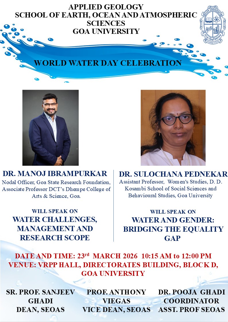 The Discipline of Applied Geology, School of Earth, Ocean and Atmospheric Sciences is celebrating World Water Day. Date & Time: 23 Mar 2026, 10.15 am - 12.00 noon; Venue: VRPP Hall, Directorates Building, Block D, Goa University. Click on the 'Know More' below for details.