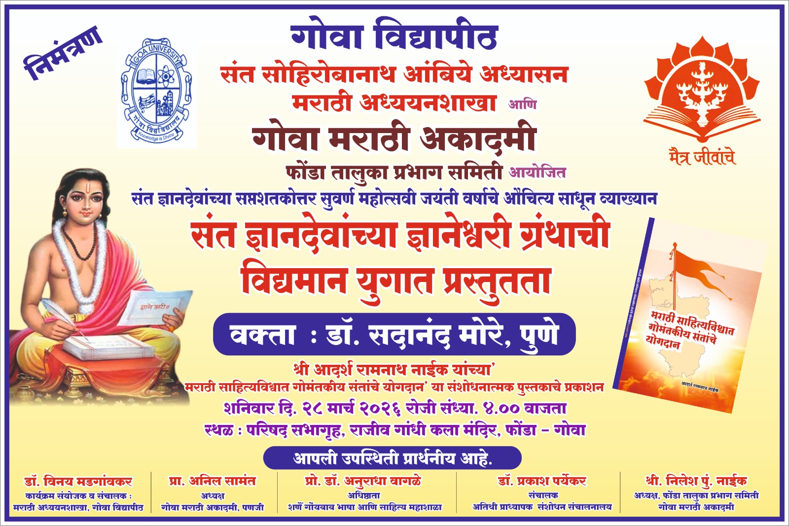 गोवा विद्यापीठाच्या संत सोहिरोबानाथ आंबिये अध्यासन, मराठी अध्ययनशाखा आणि गोवा मराठी अकादमी, फोंडा तालुका प्रभाग समिती यांच्या संयुक्त विद्यमाने संत ज्ञानदेवांच्या सप्तशतकोत्तर सुवर्ण महोत्सवी जयंती वर्षानिमित्त व्याख्यानाचे आयोजन करण्यात आले आहे. विषय: “संत ज्ञानदेवांच्या ज्ञानेश्वरी ग्रंथाची विद्यमान युगात प्रस्तुतता”, वक्ते: डॉ. सदानंद मोरे, पुणे. याच प्रसंगी श्री आदर्श रामनाथ नाईक यांच्या “मराठी साहित्यविश्वात गोमंतकीय संतांचे योगदान” या संशोधनात्मक पुस्तकाचे प्रकाशन करण्यात येणार आहे. दिनांक: २८ मार्च २०२६; वेळ: सायं. ४.०० वाजता; स्थळ: परिषद सभागृह, राजीव गांधी कला मंदिर, फोंडा – गोवा. अधिक तपशीलांसाठी खालील 'Know More' वर क्लिक करा.