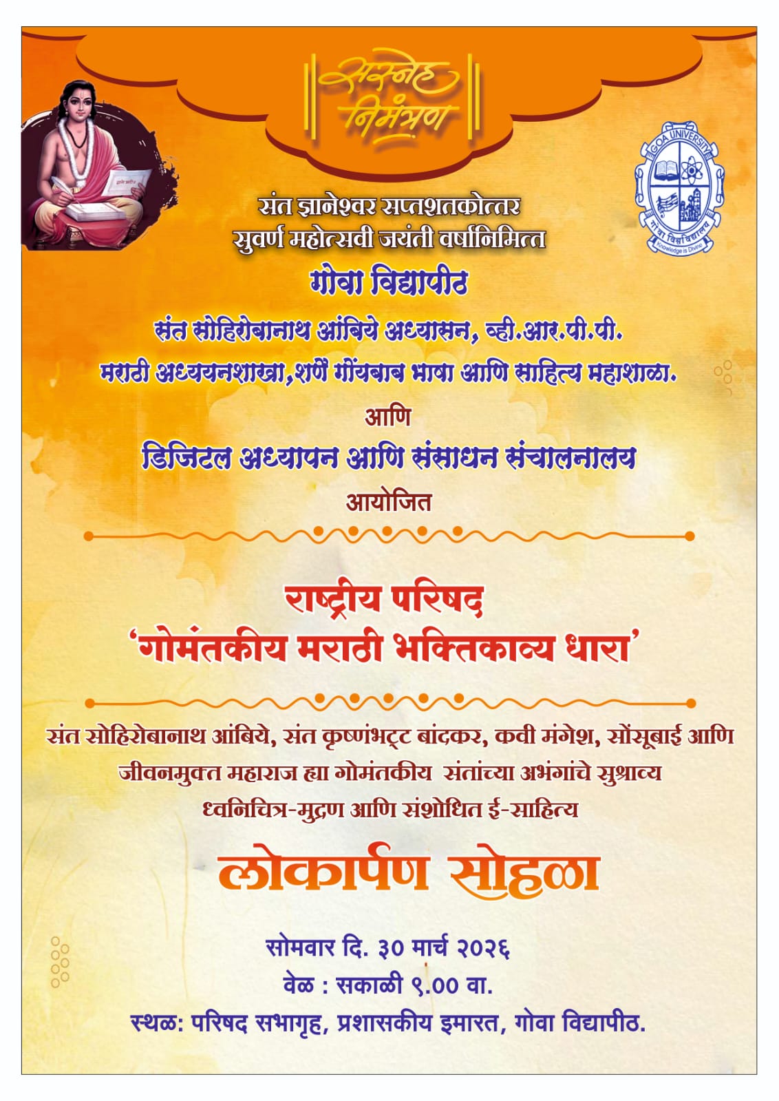 संत ज्ञानेश्वर सप्तशतकोत्तर सुवर्ण महोत्सवी जयंती वर्षानिमित्त गोवा विद्यापीठ, संत सोहिरोबानाथ आंबिये अध्ययन, व्ही. आर. पी.पी., मराठी अध्ययनशाखा, शणै गोंयबाब भाषा आणि साहित्य महाशाळा तसेच डिजिटल अध्यापन आणि संसाधन संचालनालय यांच्या संयुक्त विद्यमाने राष्ट्रीय परिसंवाद ‘गोमंतकीय मराठी भक्तिकाव्य धारा’, तसेच संत सोहिरोबानाथ आंबिये, संत कृष्णभट्ट बांदकर, कवी मंगेश, सोन्सुबाई आणि जीवनमुक्त महाराज या गोमंतकीय संतांच्या अभंगांचे सुभाष्य, ध्वनिचित्र-मुद्रण आणि संशोधित ई-साहित्य यांचा लोकार्पण सोहळा आयोजित करण्यात येत आहे. दिनांक: ३० मार्च २०२६; वेळ: सकाळी ९.०० वा.; स्थळ: परिषद सभागृह, प्रशासकीय इमारत, गोवा विद्यापीठ. अधिक तपशीलांसाठी खालील 'Know More' वर क्लिक करा.