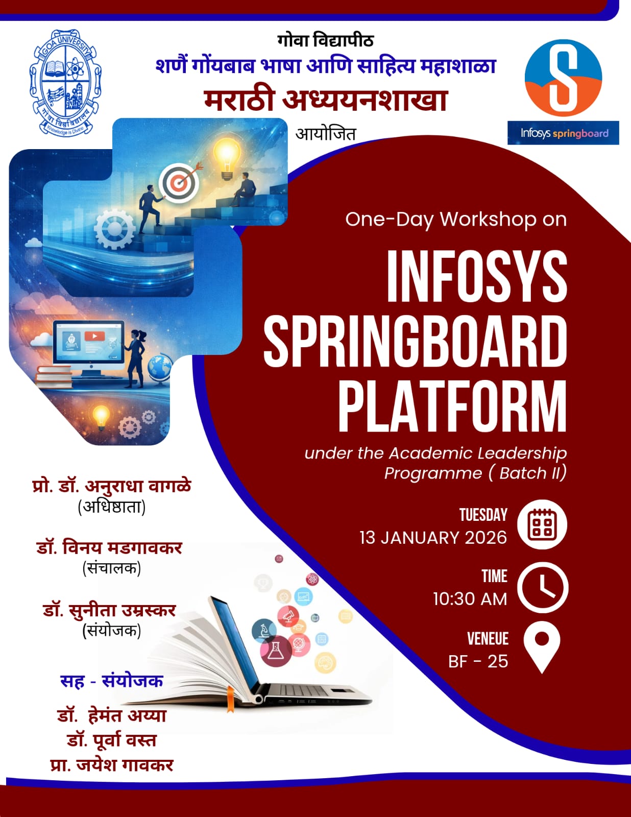 One-Day Hands-on Workshop on the Infosys Springboard Platform under the Academic Leadership Programme (Batch II) is being organised for the MA students of the Discipline of Marathi. Date & Time: 13 Jan 2026, 10:30 a.m.; Venue: Discipline of Marathi, Shenoi Goembab School of Languages and Literature, Goa University. Click on the 'Know More' below for details.