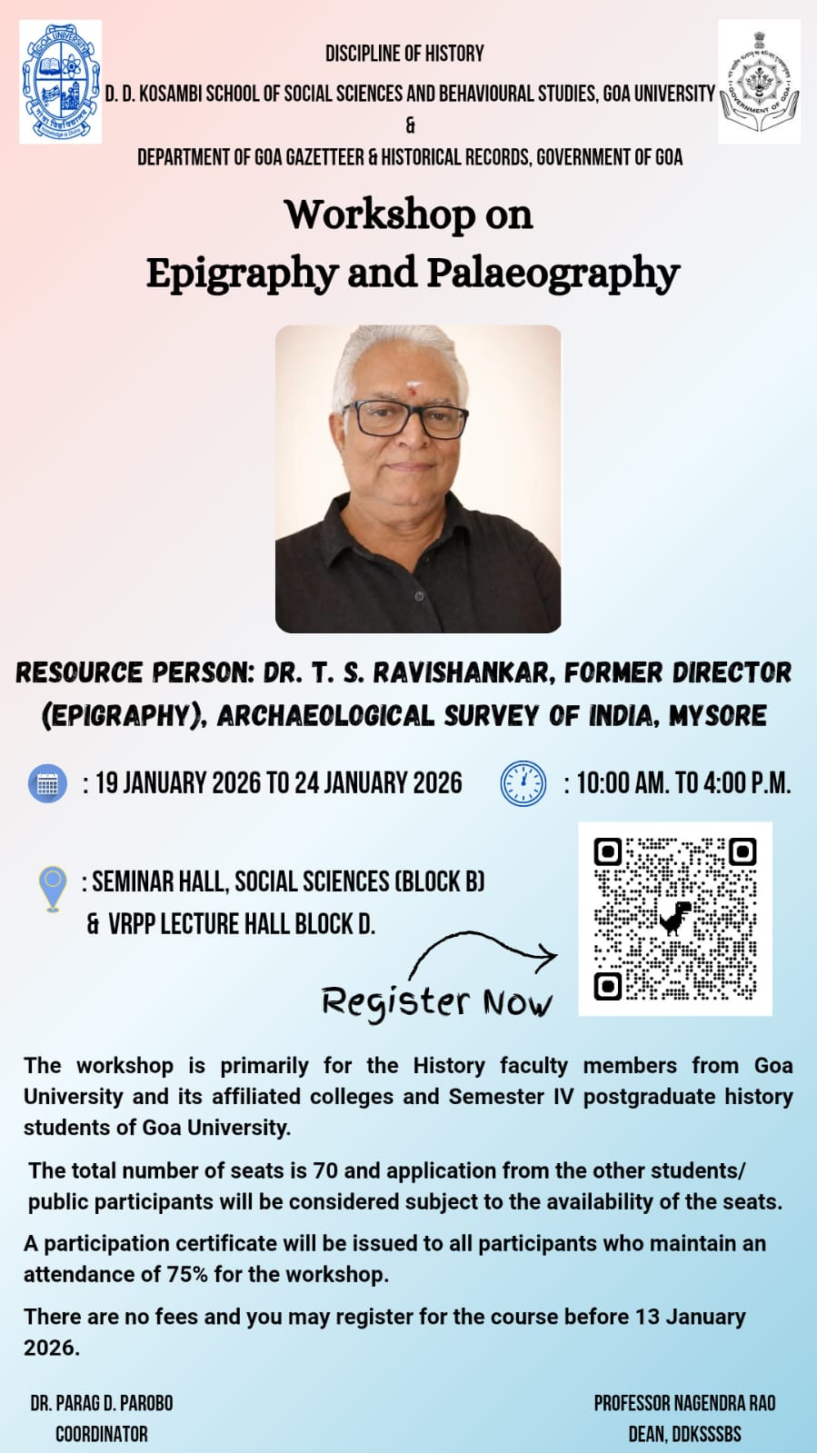Discipline of History, DDKSSSBS and the Department of Goa Gazetteer & Historical Records, Govt. of Goa, will be conducting a workshop on “Epigraphy and Palaeography”. Dr T.S. Ravishankar, Former Director (Epigraphy), Archaeological Survey of India, Mysore, will be the resource person. The workshop is primarily designed for history faculty members from Goa University and its affiliated colleges, as well as Semester IV postgraduate history students at the University. Date & Time: 19 - 24 Jan 2026, 10:00 a.m. to 4:00 p.m.; Venue: Seminar Hall, Social Sciences Block - B and VRPP Lecture Hall, Block - D, Goa University. Click on the 'Know More' below for details.