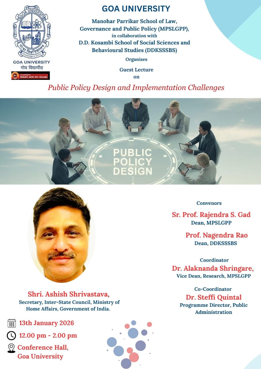 Manohar Parrikar School of Law, Governance & Public Policy (MPSLGPP) in collaboration with D.D. Kosambi School of Social Sciences and Behavioural Studies (DDKSSSBS) is organising a guest lecture on 'Public Policy Design and Implementation Challenges' by Shri. Ashish Shrivastava, Secretary, Inter-State Council, Min. of Home Affairs, GoI. Date and Time: 13 Jan 2026, 12.00 pm - 2.00 pm; Venue: Conference Hall, Goa University. Click on the 'Know More' below for details.